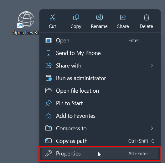 Right click your Open Dev Kit shortcut that was automatically created on the desktop, then select “Properties”.