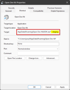 In the window that appeared, at the end of the “Target” field add --staging in all lowercase characters.